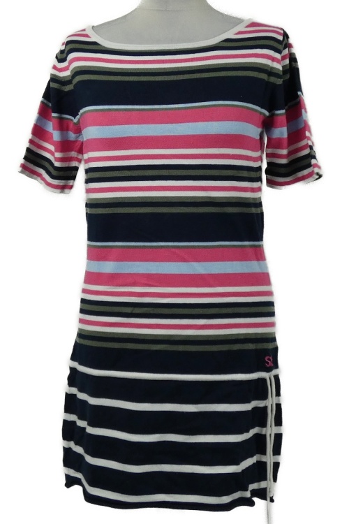 Dámské růžovo-tmavomodro-khaki pruhované pletené šaty se stahováním