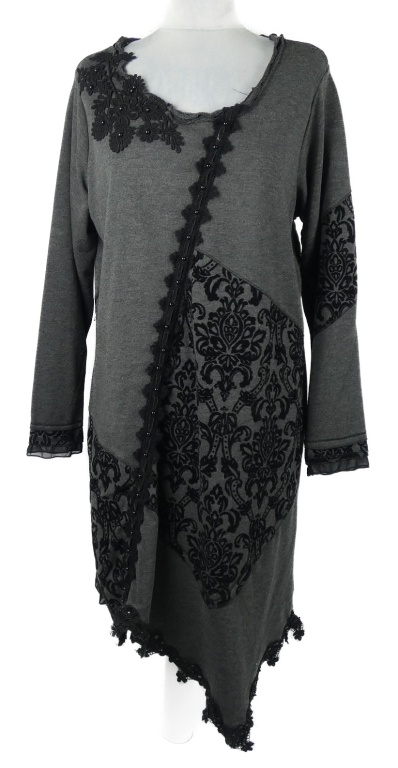 Dámské šedé asymetrické šaty s madeirou a sametovým potiskem Tredy