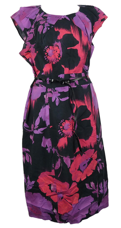 Dámské černo-fialovo-tmavorůžové květované plátěné šaty s páskem F&F