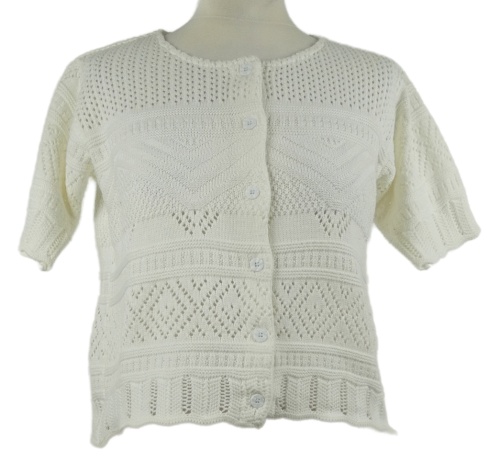 Dámský bílý ažurový propínací crop svetr s krátkými rukávy