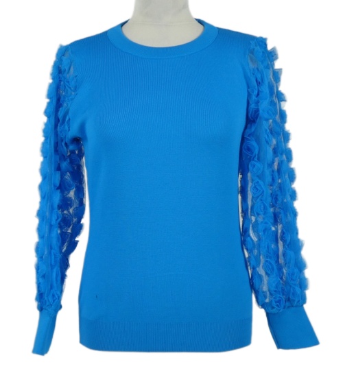 Dámský modrý svetr s tylovými vzorovanými rukávy Savida