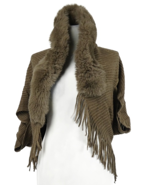 Dámský hnědý svetrový cardigán s kožíškem a třásněmi