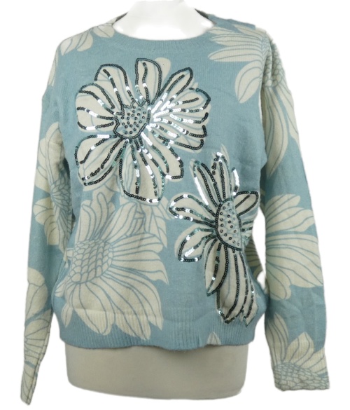 Dámský světlemodro-bílý květovaný svetr s flitry Blue Vanilla