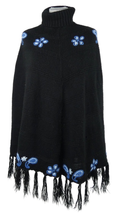 Dámské černé svetrové pončo s kytičkami a rolákem
