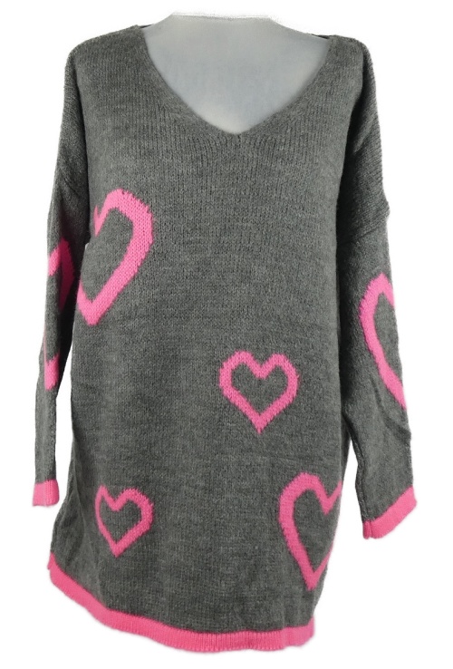 Dámský šedo-růžový srdíčkovaný dlouhý svetr