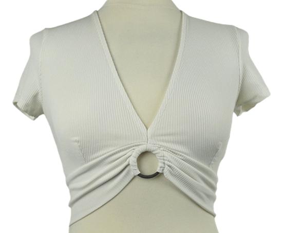 Dámské bílé žebrované crop tričko se sponou Bershka