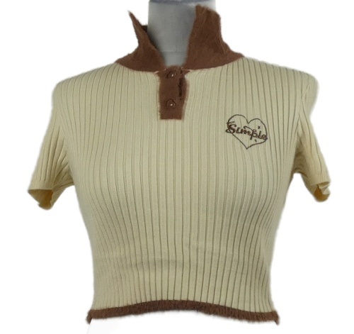 Dámské smetanovo-hnědé žebrované pletené crop tričko s límečkem Sanfu