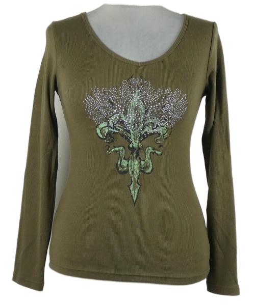 Dámské khaki žebrované triko s potiskem a kamínky Passiontex
