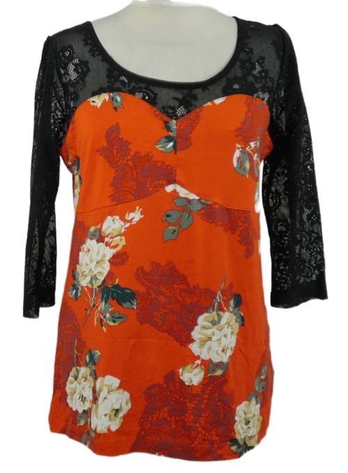 Dámské červeno-černé květované triko s krajkovými rukávy