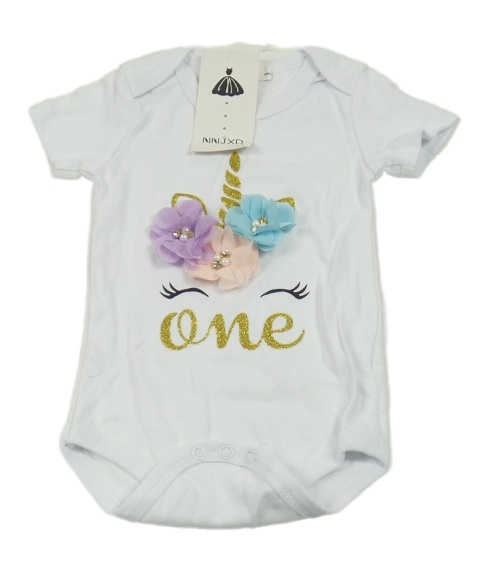 Nové - bílé body s jednorožcem a 3D květinami