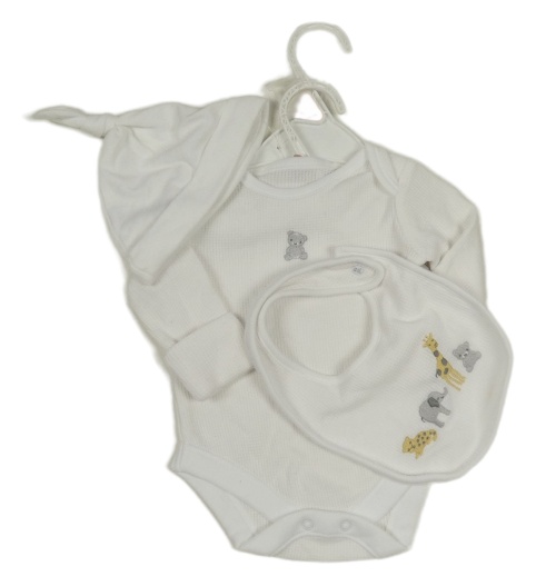 Nové - 3set - bílé body s medvídkem + bryndák s zvířátky + čepice Nutmeg