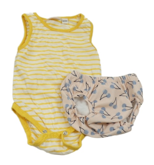 2Set - Bílo-žluté pruhované body Liegelind + pudrové plavkové kalhotky s třešničkami Benetton