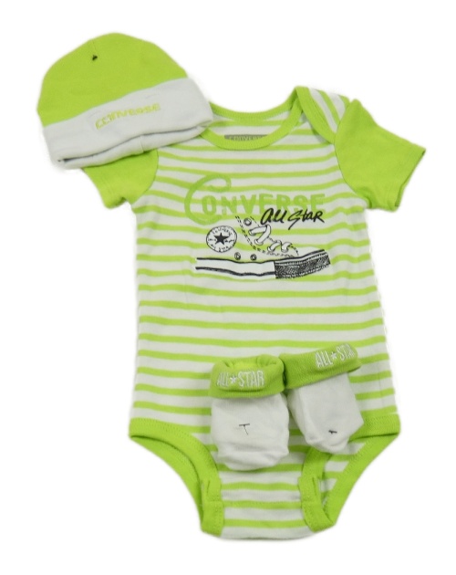 3set - Limetkovo-bílé pruhované body s teniskou + bavlněná čepice + ponožky Converse