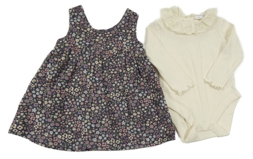 • 2set - Smetanové žebrované body s límečkem s madeirou + tmavomodro-barevné květované šaty