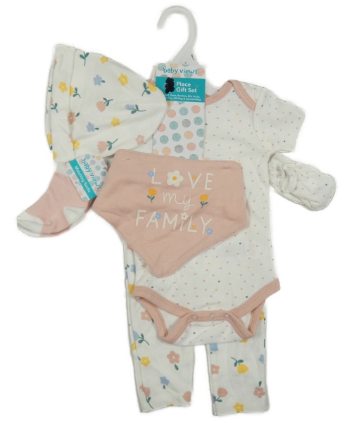 6set - bílé legíny s kvítky + bílé puntíkaté body + slinták + čepice + ponožky + rukavice