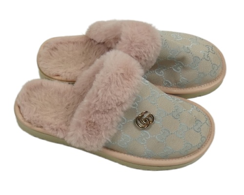 • Pudrovo-starorůžové domácí pantofle se vzorem a kožešinou vel. 35