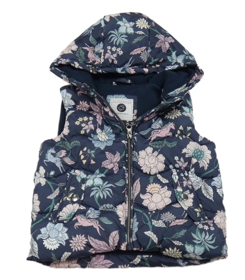 Tmavomodrá šusťáková zateplená květovaná vesta s jednorožci a kapucí Tu
