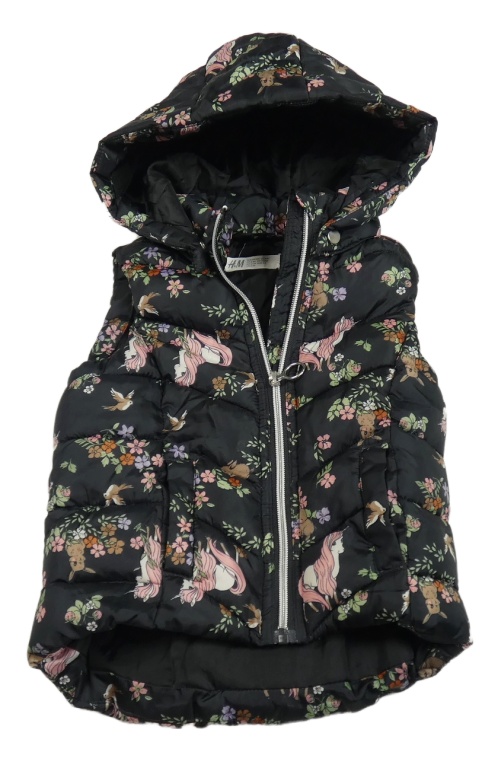 Černá šusťáková prošívaná zateplená kombinéza s jednorožci a odepínací kapucí H&M