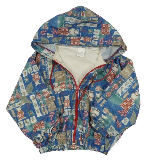 Modro-béžovo-červená šusťáková podzimní bunda s potiskem a kapucí