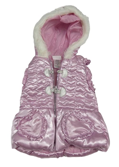 Růžová lesklá prošívaná šusťáková zateplená vesta se srdíčky a kapucí