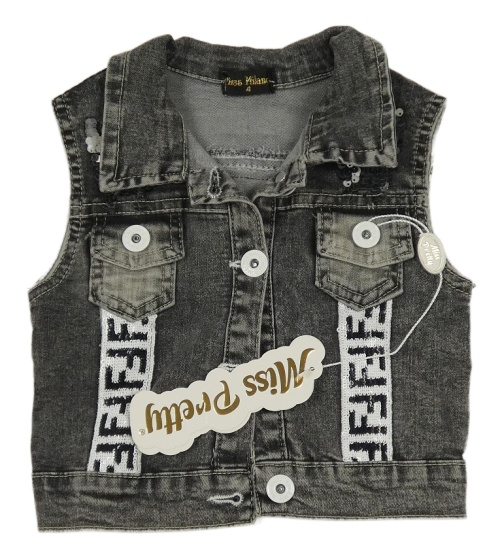 Nové - tmavošedá crop riflová vesta s nápisem z flitrů