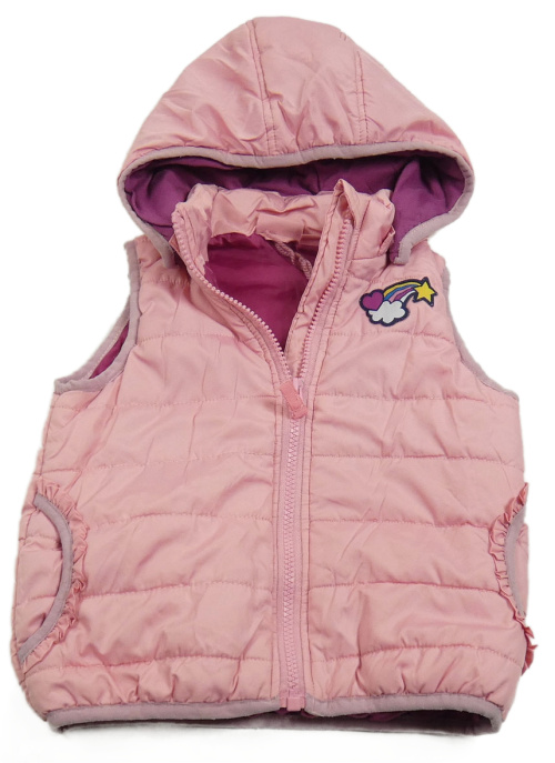 • Růžová prošívaná šusťáková zateplená vesta s duhou a obláčkem a volánky a odepínací kapucí impidimpi