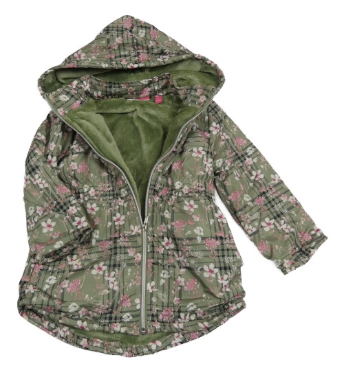 Khaki-tmavokhaki kostkovaná šusťáková jarní zateplená parka s kytičkami a kapucí