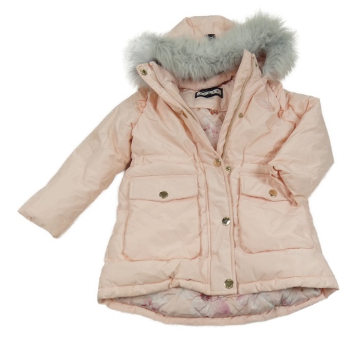 Světlerůžová šusťáková zimní parka s nášivkou a volánky a kapucí s kožešinou TED BAKER