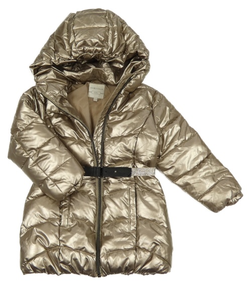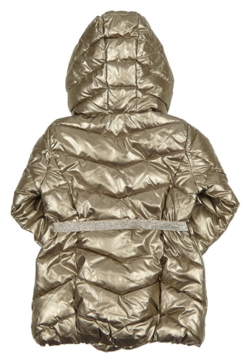 Zlatá lesklá šusťáková zimní bunda s páskem a kapucí