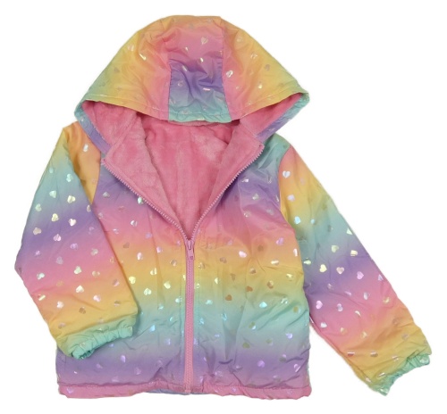 Barevná šusťáková lehce zateplená bunda se srdíčky a kapucí