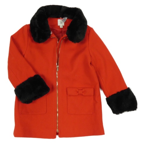 Červený flaušový podšitý kabát s mašlemi a černou kožešinou a límečkem RIVER ISLAND