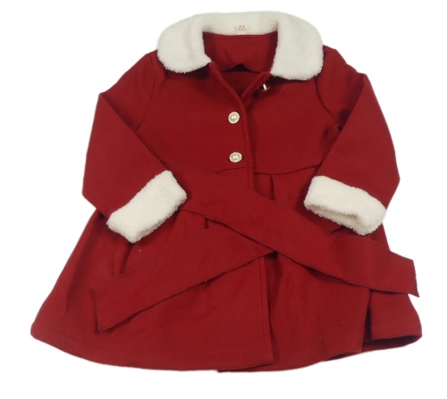 Tmavočerveno-bílý flaušový kabát s límečkem a páskem