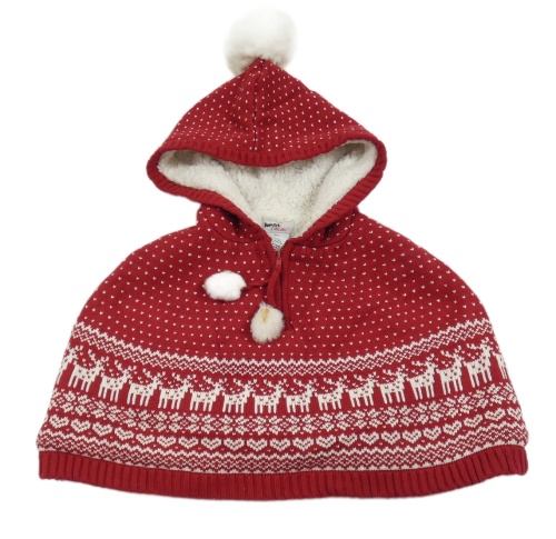 Červeno-bílé vzorované pletené zateplené pončo s bambulemi a kapucí