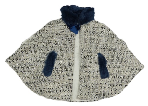 Smetanovo-šedé vzorované pletené podšité pončo s tmavomodrou kožešinou z