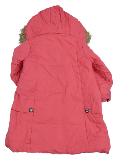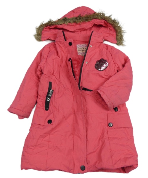 • Jahodový prošívaný šusťákový zimní kabát s jahůdkou z flitrů a odepínací kapucí s kožešinou