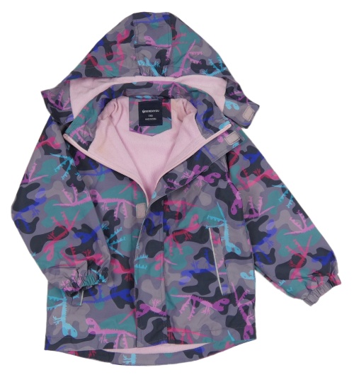 Fialovo-zelená army šusťáková zateplená bunda s dinosaury a kapucí