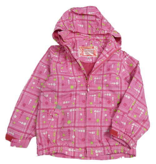 Růžovo-bílá kostkovaná šusťáková jarní bunda s puntíky a kapucí