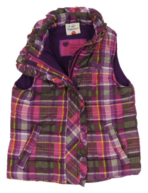 Fialovo-růžovo-zelená kostkovaná šusťáková zateplená vesta s koníkem Topolino