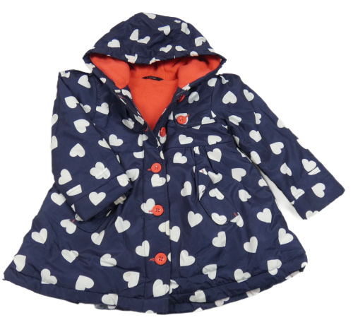 Tmavomodrý šusťákový pod/zimní kabát s bílými srdíčky a kapucí George