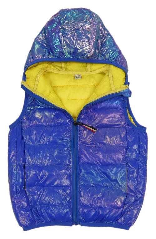 Modrá metalická šusťáková zateplená vesta s kapucí