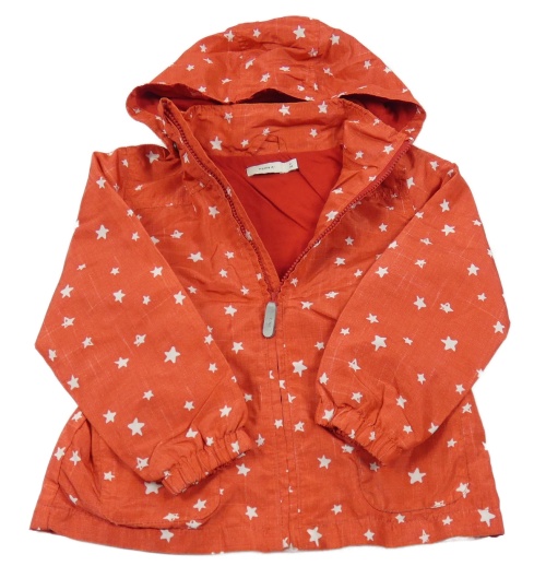 Červená melírovaná šusťáková jarní parka s hvězdami a kapucí