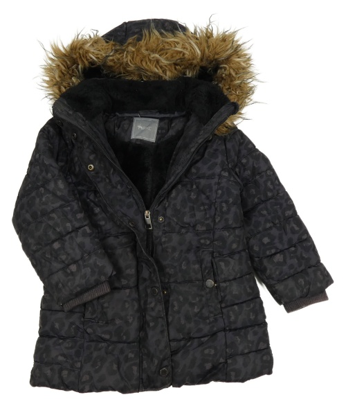 Tmavošedo-černý vzorovaný prošívaný šusťákový zimní kabát s kapucí s kožešinou Next