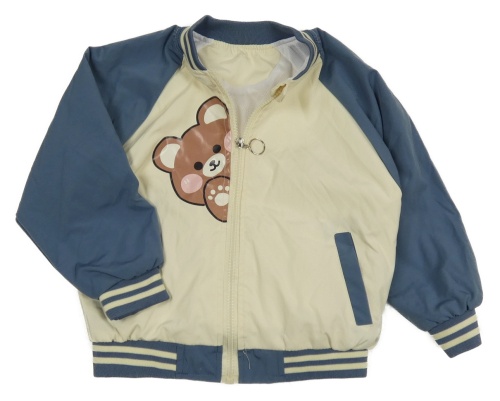 Smetanovo-modrošedý šusťákový jarní bomber s medvídkem a pruhy
