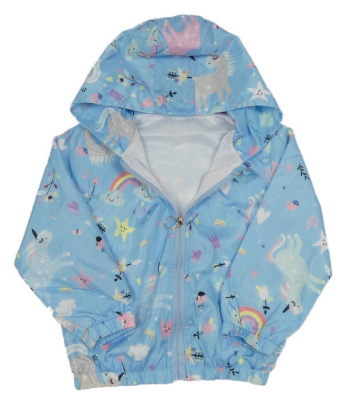 Světlemodrá šusťáková jarní bunda s obrázky a kapucí