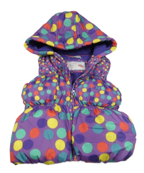 Fialovo-barevná puntíkatá šusťáková zateplená vesta s kapucí
