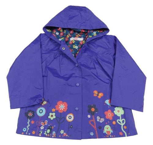 Tmavofialová šusťáková jarní bunda s kytičkami a motýlky a kapucí