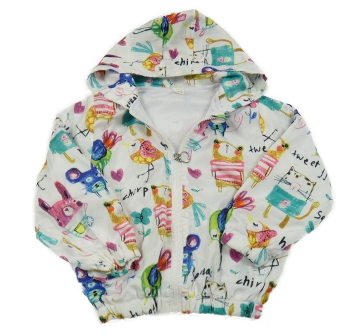 Bílá šusťáková jarní bunda se zvířaty a kapucí