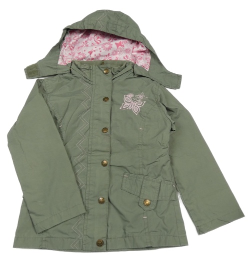 Khaki šusťáková jarní bunda s motýlkem a kapucí