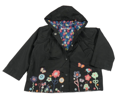 Černá šusťáková jarní bunda s květinami a kapucí
