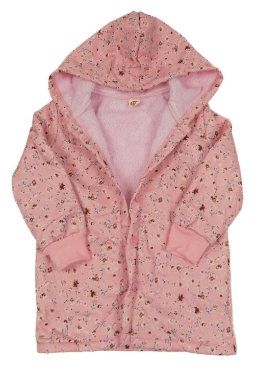 Růžový zateplený kabát s kytičkami a kapucí